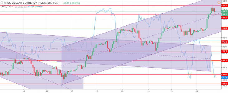 The US dollar index chart. The current price is 96.40 (10-year government bonds yield is the blue line)