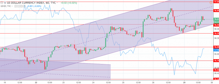 The US dollar index chart. The current price is 96.60 (10-year government bonds yield is the blue line)