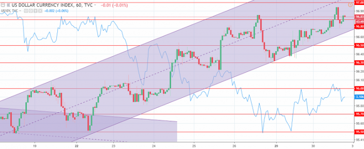 The US dollar index chart. The current price is 96.80 (10-year government bonds yield is the blue line)