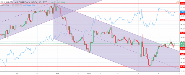 The US dollar index chart. The current price is 96.20 (10-year government bonds yield is the blue line)