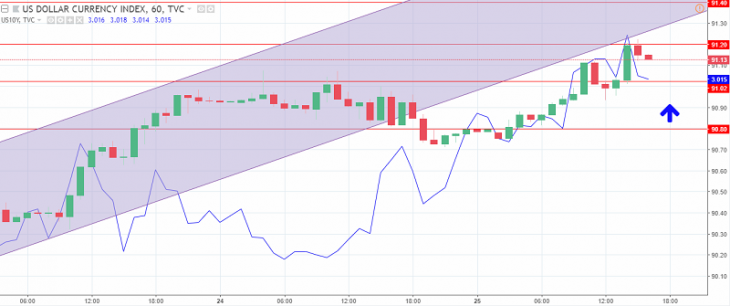 Graph of the US dollar index. The current price is 91.20 (the yield of 10-year government bonds is a blue line)