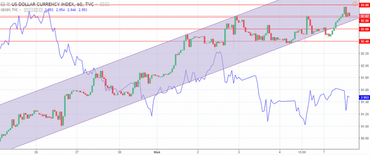 Graph of the US dollar index. The current price is 92.80 (the profitability of 10-year government bonds is a blue line)