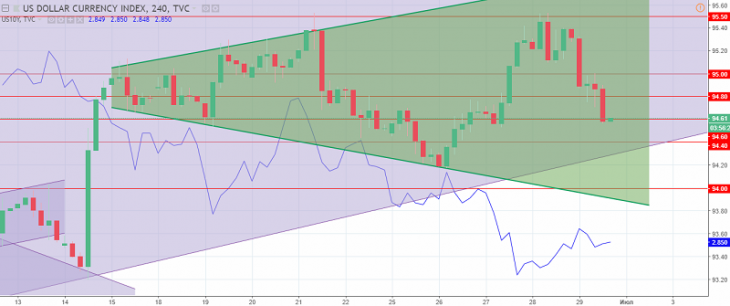 The last week of June turned out to be very ambiguous for the US currency and depended largely on the mood of the market. The beginning of the week was a continuation of the sale of the American dollar, as a result, the minimum of the last weeks was updated (94.20).