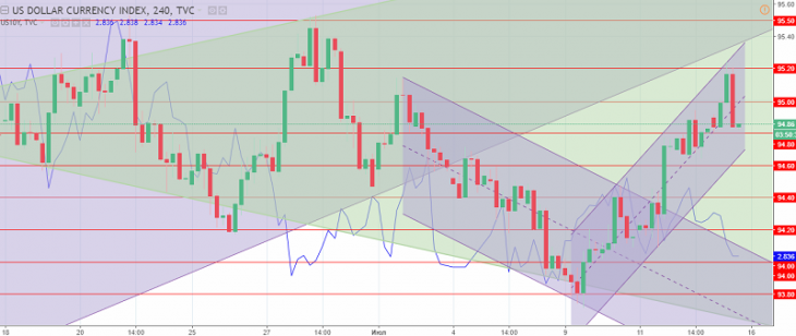 The US dollar index H4 chart. The current price is 94.80 (10-year government bonds yield is a blue line)