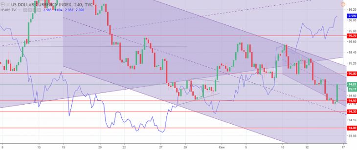 The US dollar index H4 chart. The current price is 94.80 (10-year government bonds yield is a blue line)