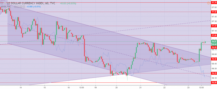 Fig. 2. The US dollar index chart. The current price is 96.80 (10-year government bonds yield is the blue line)