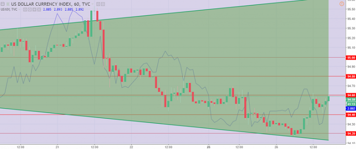 US dollar index Graph. The current price is 94.60 (the yield of 10-year government bonds is a blue line)