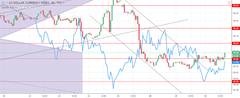 Fig. 2. The US dollar index chart. The current price is 95.80 (10-year government bonds yield is the blue line)
