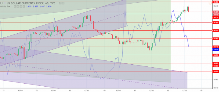 Fig. 2. The US dollar index chart. The current price is 95.20 ( 10-year government bonds yield is a blue line)
