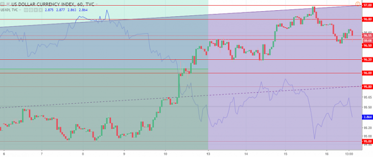 Fig. 2. The US dollar index chart. The current price is 96.50 (10-year government bonds yield is a blue line)