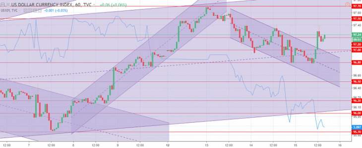 Fig. 2. The US dollar index chart. The current price is 97.20 (10-year state bonds yield is the blue line)