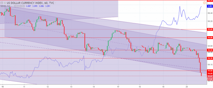 Fig. 2. The US dollar index chart. The current price is 93.90 (10-year government bonds yield is a blue line)