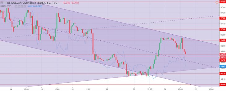 Fig. 2.The US dollar index chart. The current price is 96.50 (10-year government bonds yield is the blue line)