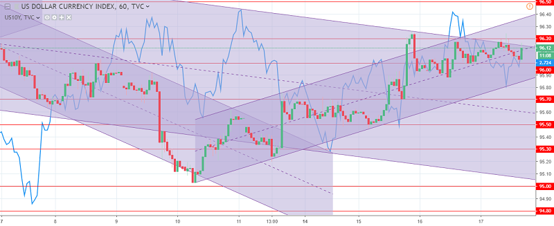 Fig. 2. The US dollar index chart. The current price is 96.10 (10-year government bonds yield is the blue line)