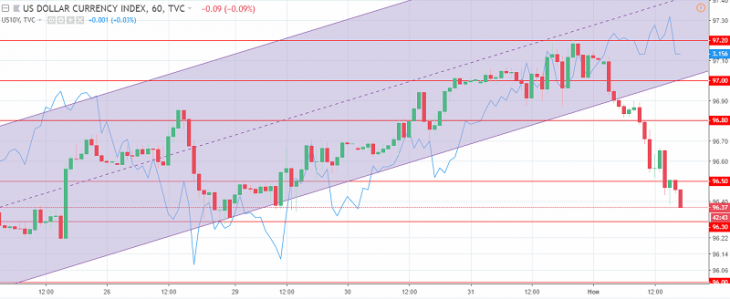 The US dollar index chart. The current price is 96.40 (10-year government bonds yield is the blue line)