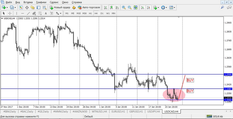 Let’s take a look at the charts. Figure # 1 – timeframe H4. The pair came close to the psychological level of 1.2300. In fact, the second touch of this level, which can form a double bottom with the development potential of the figure to 1.2500. In turn, the breakdown will open the movement to strengthen the Canadian dollar to the level of 1.2200.