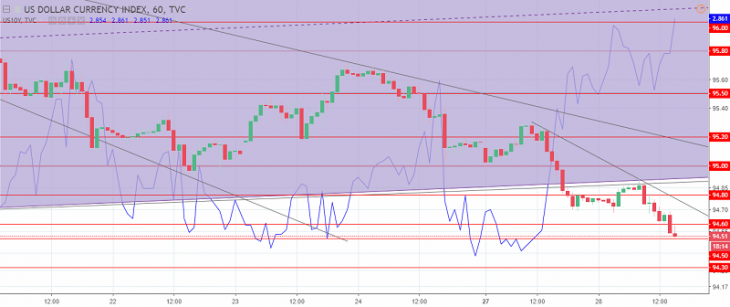 The US dollar index chart. The current price is 94.50 (10-year government bonds yield is a blue line)