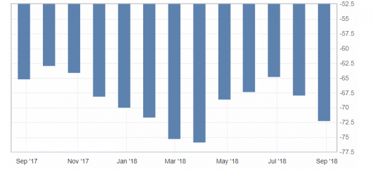 - US Goods trade balance of (July), fact -72.20B, forecast -68.60B.