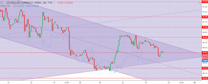 The US dollar index chart. The current price is 96.50 (10-year government bonds yield is the blue line)