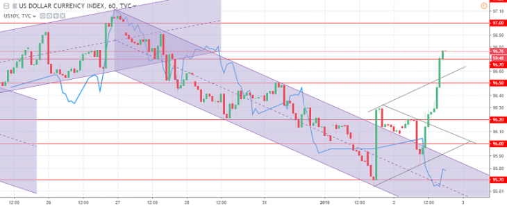 The US dollar index chart. The current price is 96.80 (10-year government bonds yield is the blue line)