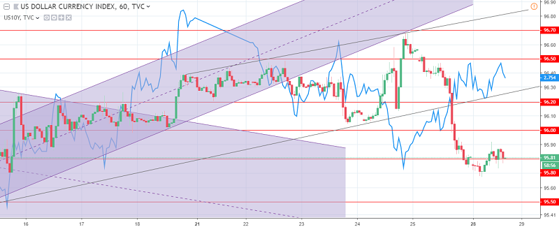 The US dollar index chart. The current price is 96.80 (10-year government bonds yield is the blue line)