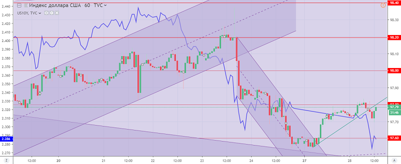 Multidirectionality and lack of clear dynamics persists in the US dollar index. Despite the upward impulse, the American dollar is limited to the resistance zone 97.80-90. The negative opening of US stock exchanges will increase the pressure on the American dollar.