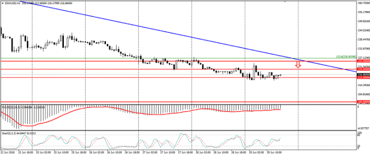 After another decline and a minor correction, the pair DSH/USD remains under pressure. In conditions of safety of the two-month downtrend, after the upward correction to 220-225.000, we should expect further decline of this pair. With fixing DSH / USD below 215-210.000 it is necessary to expect a test of support levels: 200.000 and 190.000.