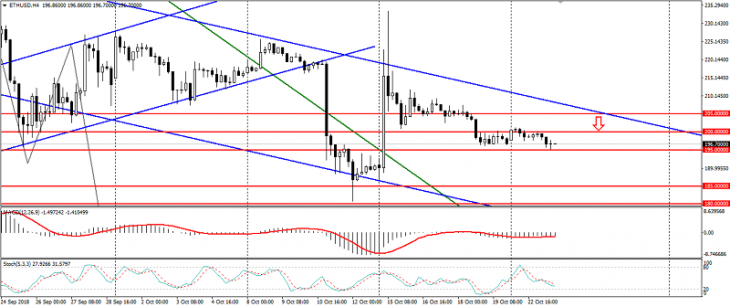 The ETC/USD pair, amid a general slowdown in the crypto-currency market and moving to the consolidation phase, remains under pressure from a downtrend, while limiting to the support level of 195-199.000. A break below will indicate a resumption of decline with a test of support at levels: 185.000 and 180.000. Resistance is located at levels: 200.000 and 205.000.