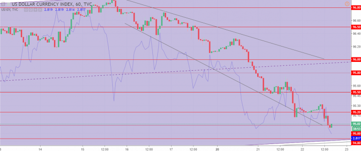The US dollar index chart. The current price is 95.00 (10-year government bonds yield is a blue line)