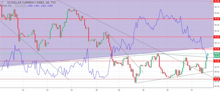 The US dollar index chart. The current price is 94.70 (10-year government bonds yield is a blue line)