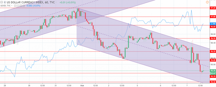 The US dollar index chart. The current price is 95.80 (10-year government bonds yield is the blue line)